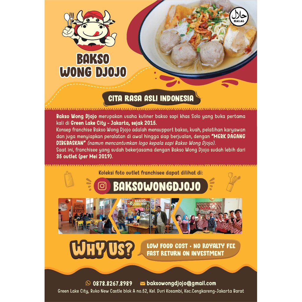 Bakso atau baso adalah jenis bola daging yang lazim ditemukan pada masakan indonesia. Bagi anda yang berminat untuk usaha bakso dengan merk yang sudah dikenal luas, tanpa franchise fee, tanpa royaty fee, modal. Apakah anda tertarik untuk memulai bisnis kuliner ?